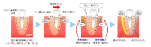矯正装置が歯に力を加えると、歯の周りの歯槽骨に変化が生じます。この力がかかっている側では、骨の吸収が進み、歯がその方向に動きます。一方、力がかかっていない反対側では、新しい骨が生成されます。この骨のリモデリング(再構築)を通じて、歯が目的の位置に移動します。