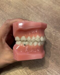 顎間ゴムは、上下の歯列を引っ張って噛み合わせを改善し、歯が正しい位置に動くのをサポートします。
