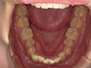 下顎が小さめの場合、歯が生えるスペースが足りず、前歯が重なり合ってしまうことがあります。
